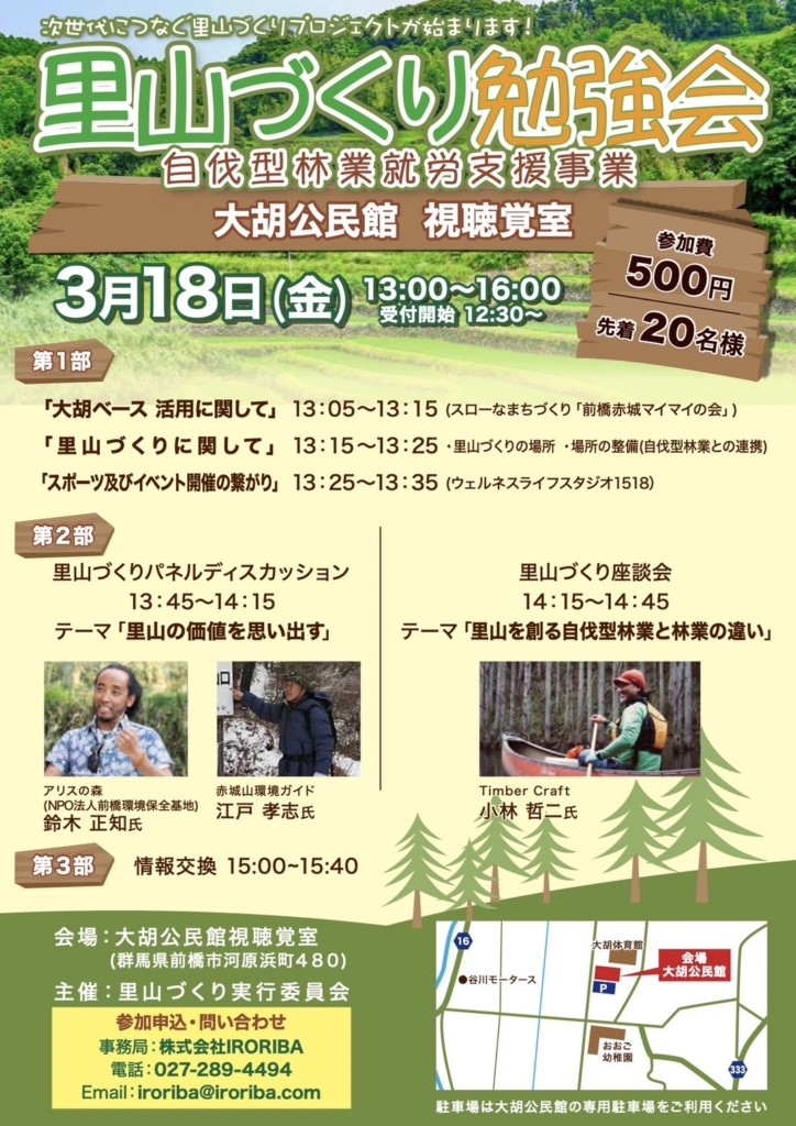 第1部 大胡ベース活用に関して 里山づくりに関して スポーツ及びイベント開催の繋がり第2部里山づくりディスカッション「里山の価値を思う出す」里山づくり座談会「里山を創る自伐型林業と林業の違い」第3部 情報交換